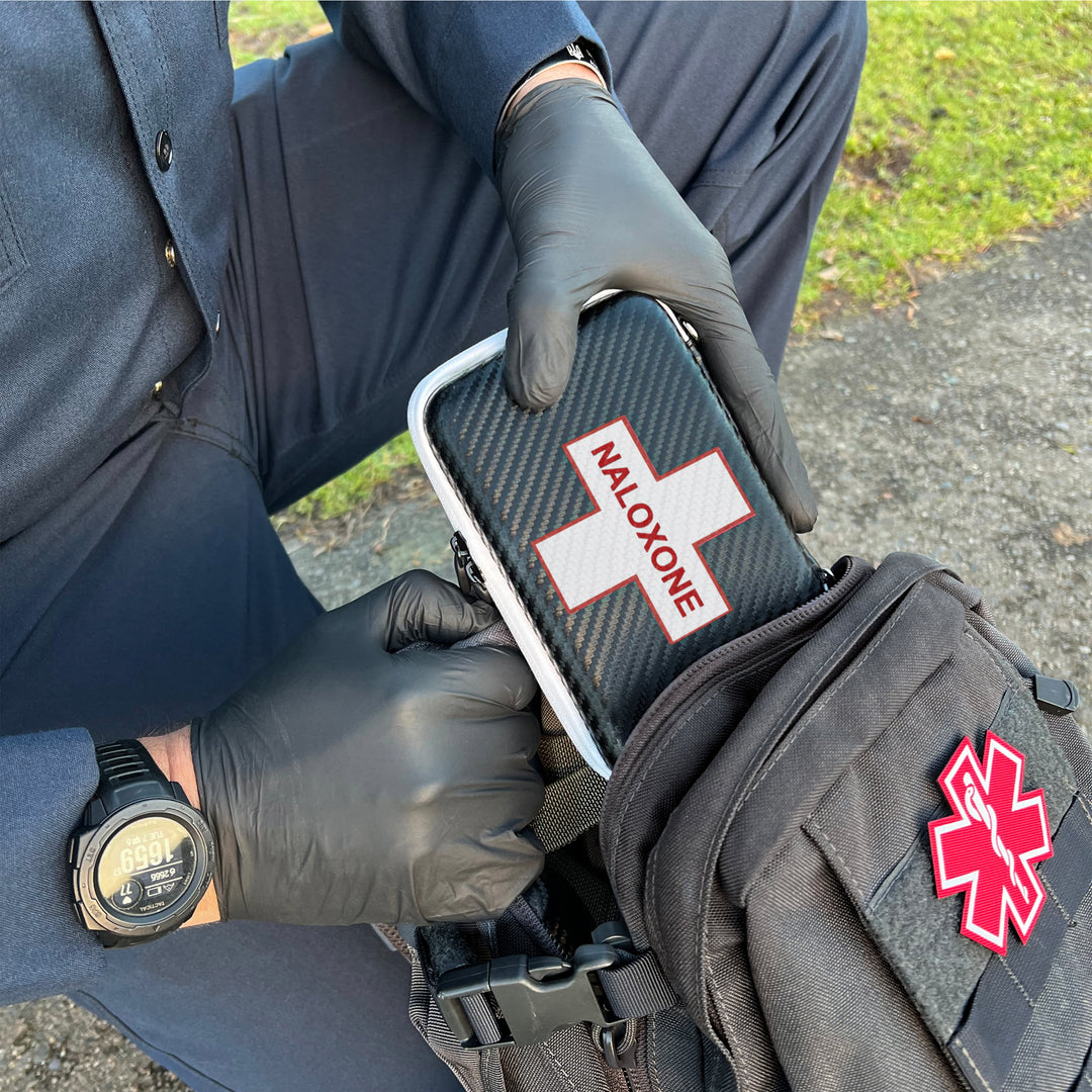 The case is also sized to securely hold other medical accessories commonly used in an overdose kit including nitrile gloves, CPR breathing shield, gauze and towels, and antiseptic wipes.
