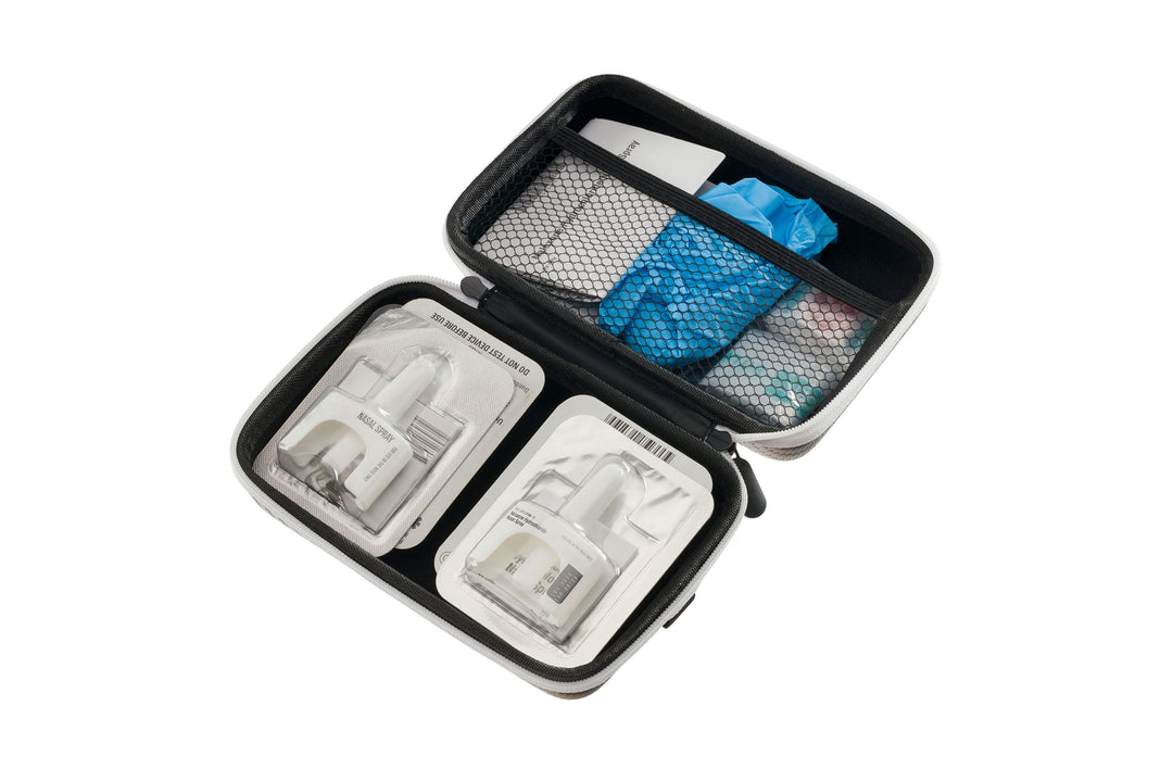 The case is also sized to securely hold other medical accessories commonly used in an overdose kit including nitrile gloves, CPR breathing shield, gauze and towels, and antiseptic wipes.