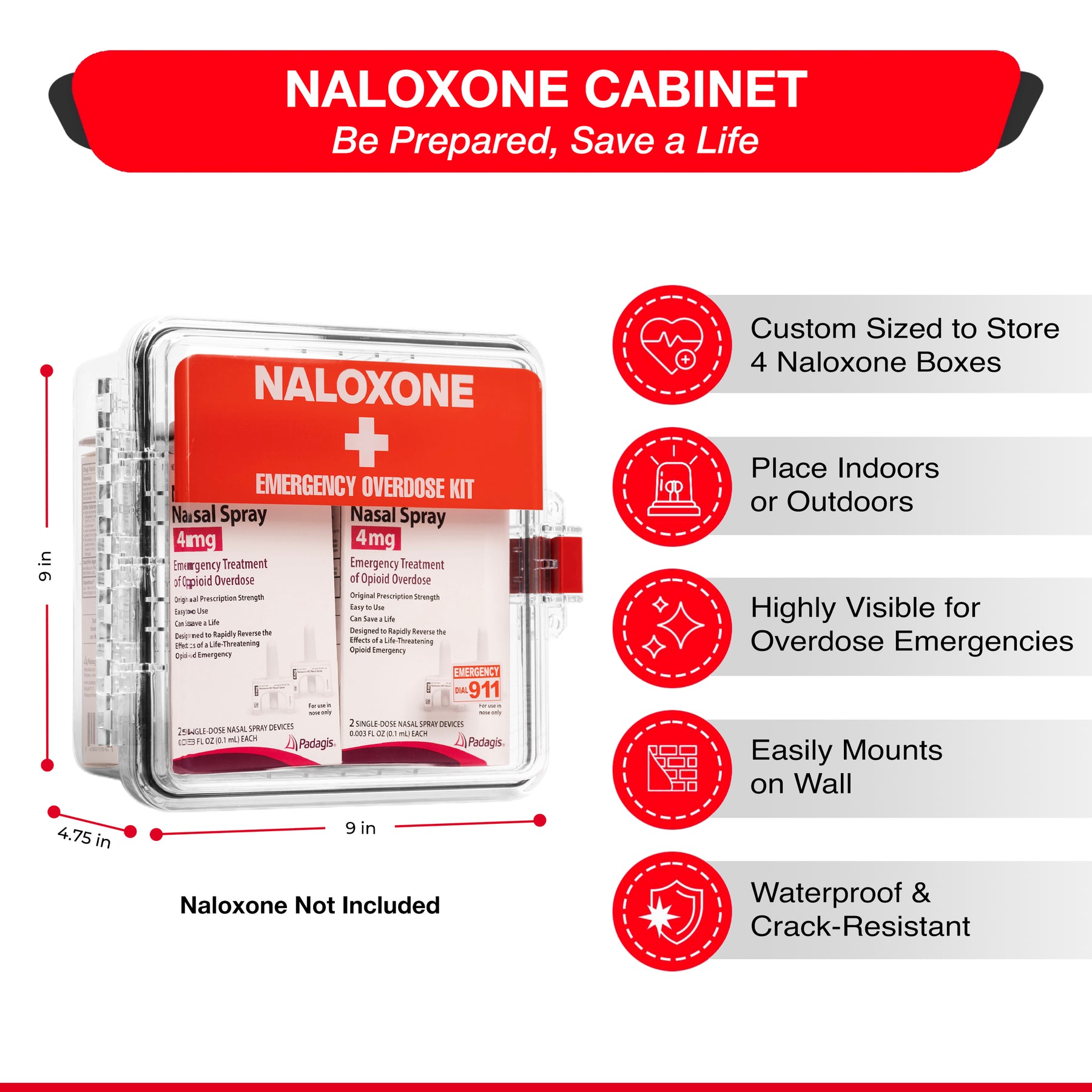Accommodates up to 4 Naloxone nasal spray boxes plus essential accessories like gloves or CPR breathing shields.