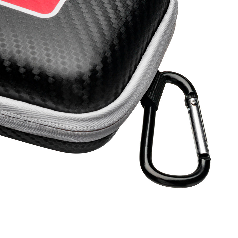 A convenient carabiner allows for easy carrying, hanging and attachment to equipment or apparel.
