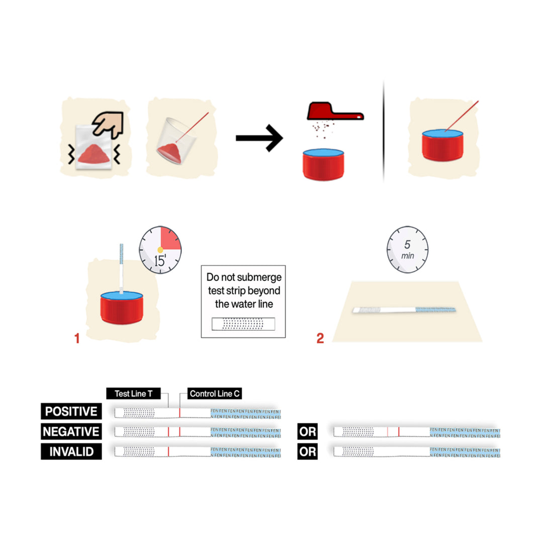 Dip test strip below the max water line for 15 seconds. Wait 5 minutes for the test results to appear.