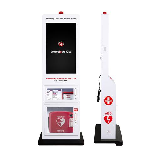 The cabinet, labeled "EMERGENCY MEDICAL STATION," features a clear window showcasing the AED, Naloxone and Bleeding Kit.