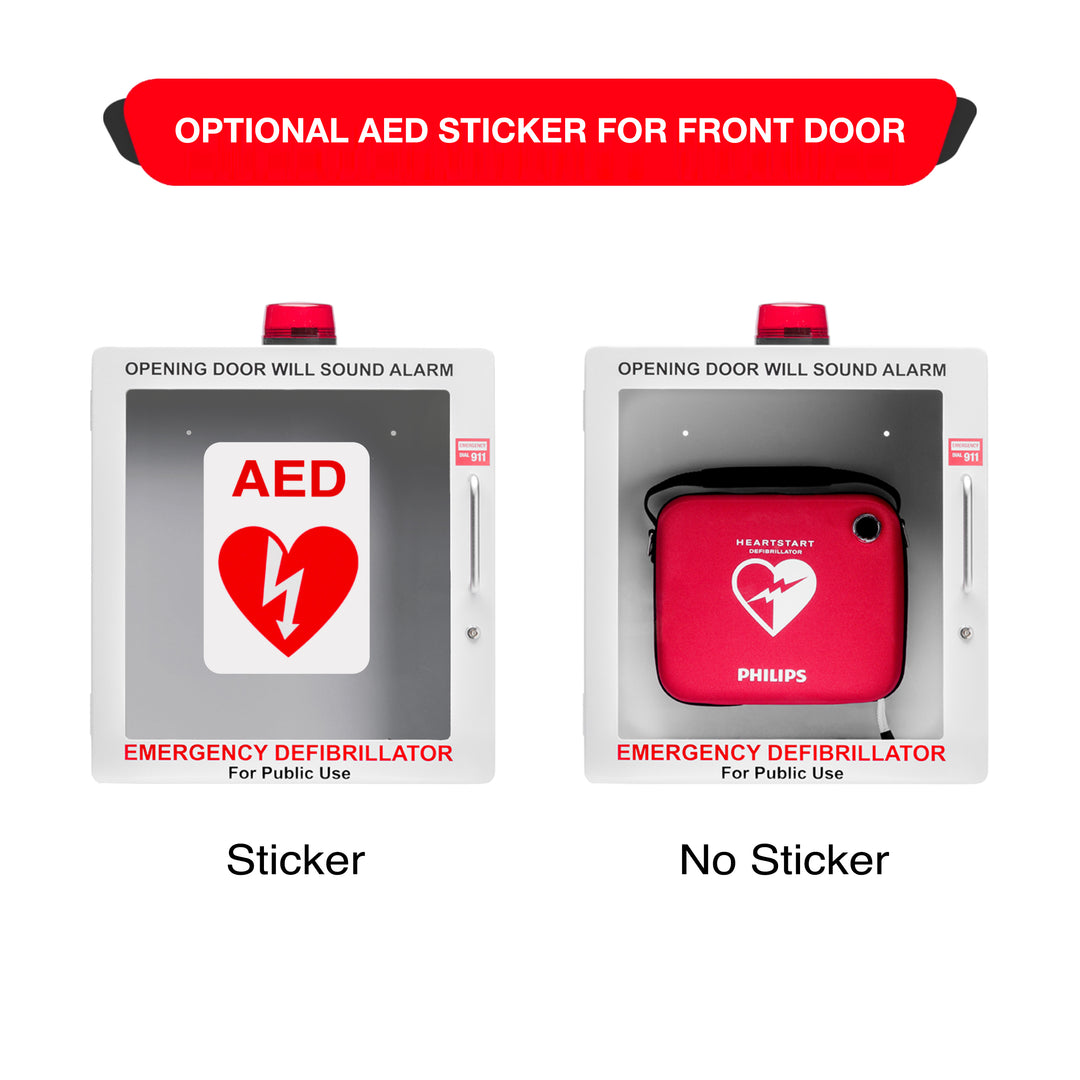 The AED cabinet, labeled "EMERGENCY DEFIBRILLATOR" with the universal symbol, has a clear window displaying the AED. An optional AED symbol sticker is included for quick identification.