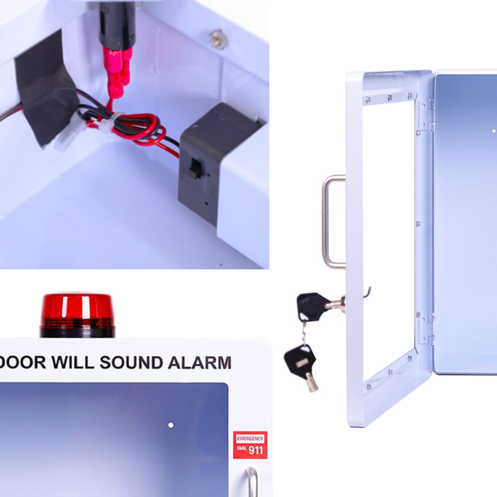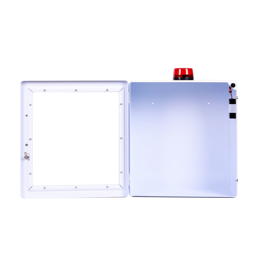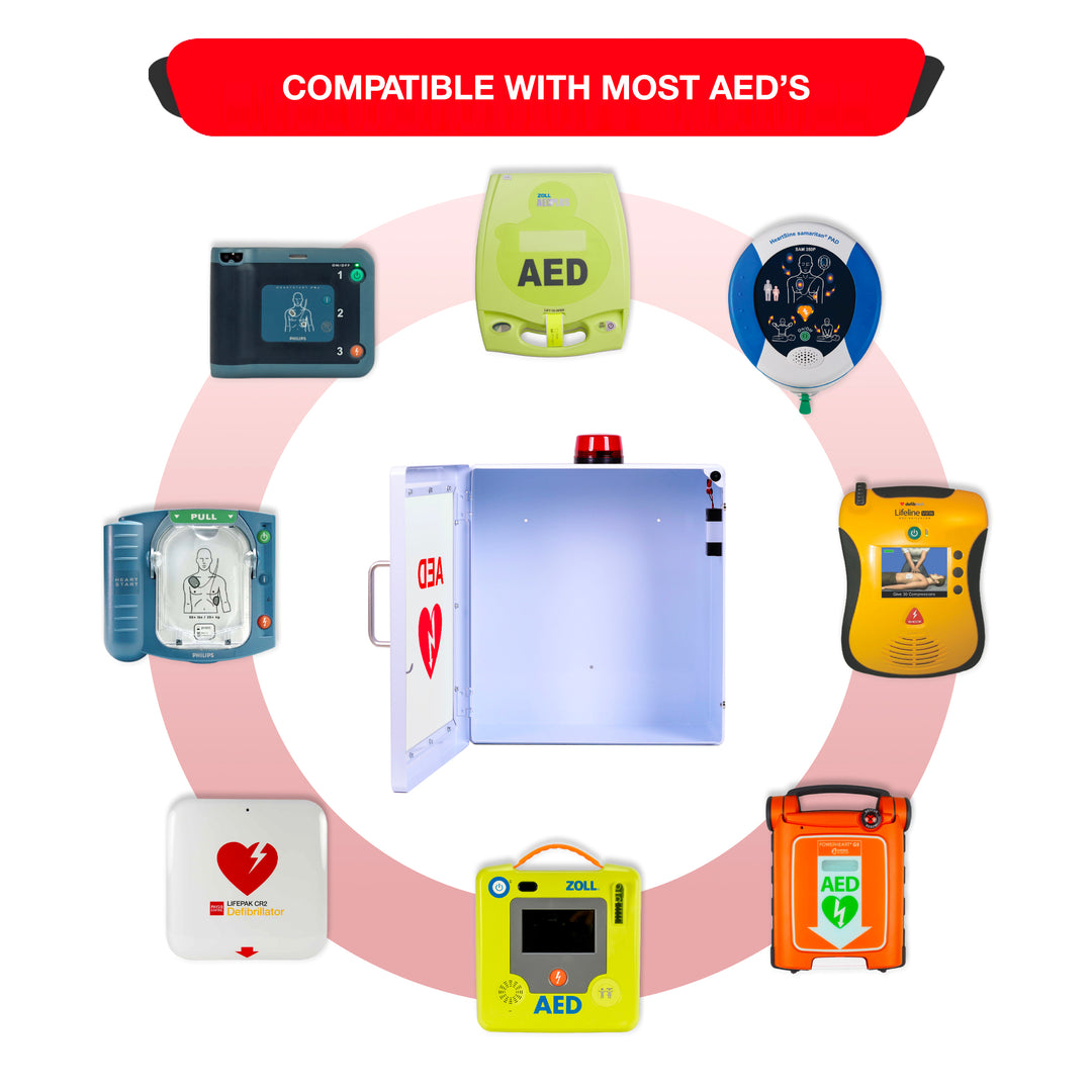 The AED cabinet is compatible with all AED brands, including Philips HeartStart, Zoll, Cardiac Science, Defibtech, LIFEPAK, and HeartSine.