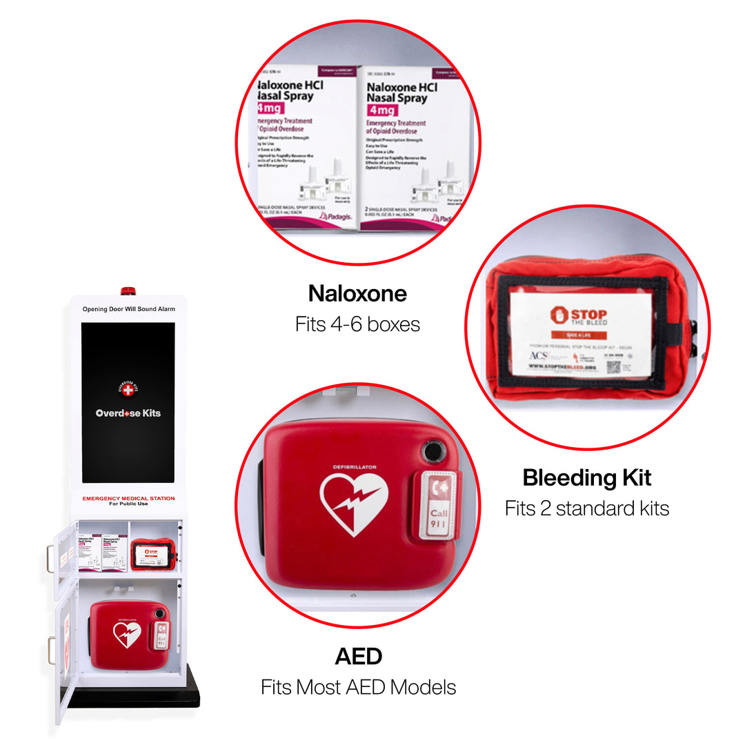The cabinet, labeled "EMERGENCY MEDICAL STATION," features a clear window showcasing the AED, Naloxone and Bleeding Kit.
