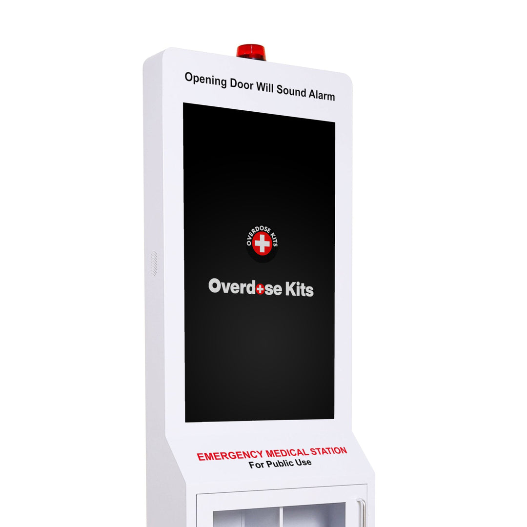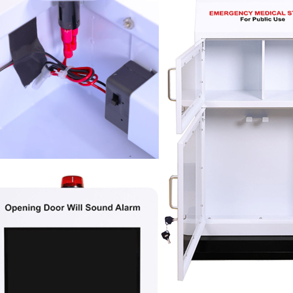 The large 32-inch LCD display provides valuable educational content on handling medical emergencies, such as AED use, opioid overdose response, CPR, and bleeding control. Additionally, it offers a platform for local businesses to sponsor and fund the station through programmed video ads, while connecting easily via Wi-Fi or USB and fitting standard power outlets.