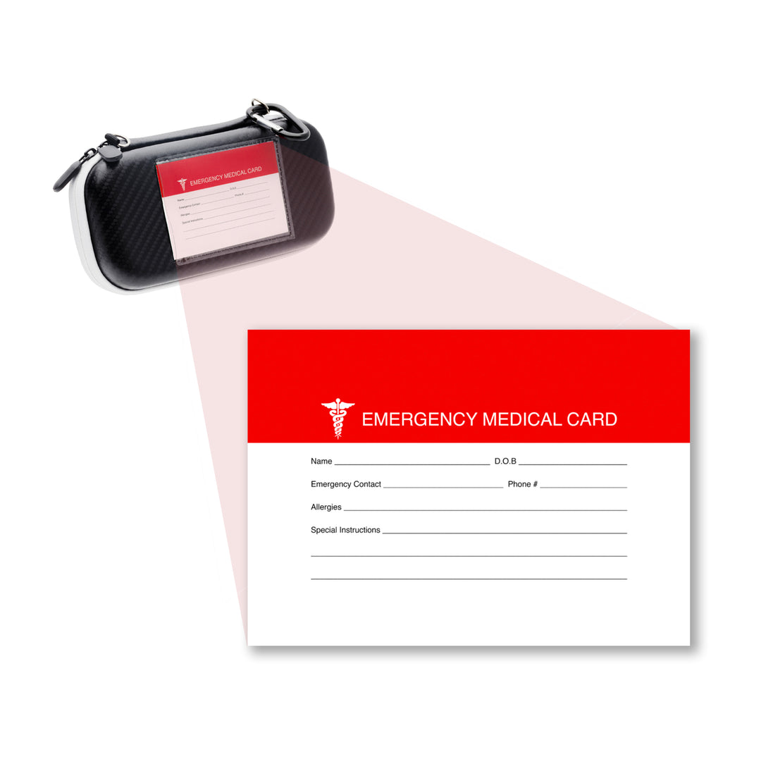 A dedicated slot on the outside of the case holds a Medical Identification Card for swift emergency response. The case is clearly labeled "Epinephrine" for quick and easy identification.