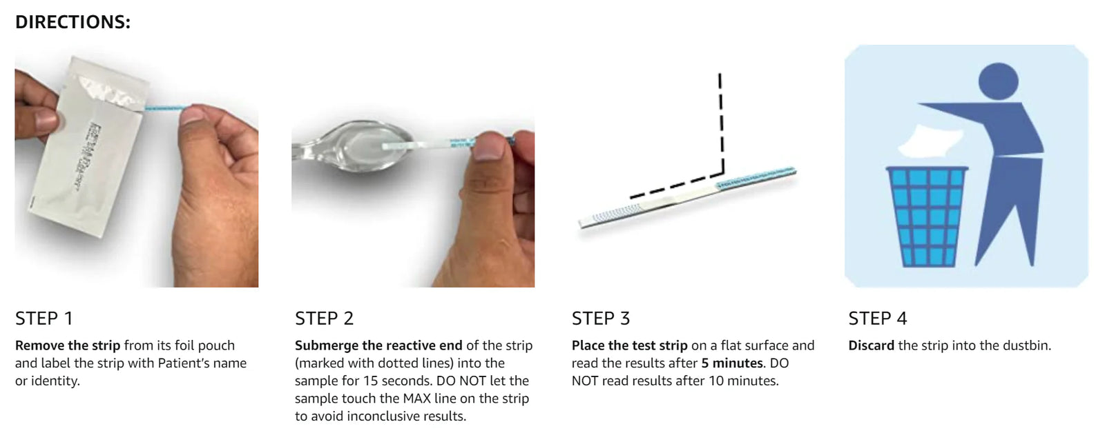 Simple Instructions - Add 10 drops of water to the powder or crushed pill substance you wish to test. Dip test strip below the max water line for 15 seconds. Wait 5 minutes for the test results to appear.