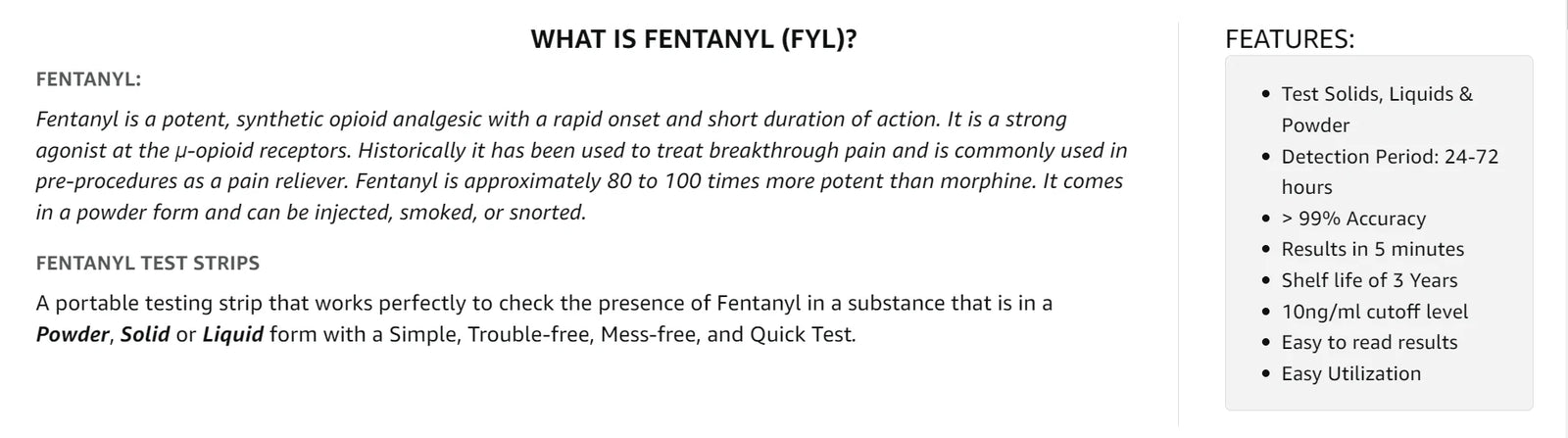 Highly Sensitive - WHPM FYL test strips are able to detect as little as 10 (ng/ml) of FYL while the industry standard is 200 (ng/ml).