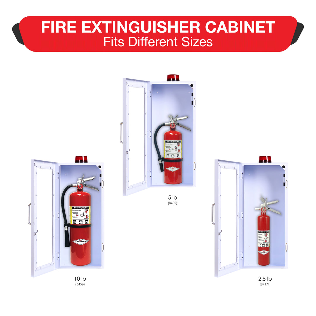 Securely store 2.5, 5, or 10-pound fire extinguishers with ample room for easy access and removal. The cabinet is clearly labeled "FIRE EXTINGUISHER" with a "FIRE" symbol for quick identification.