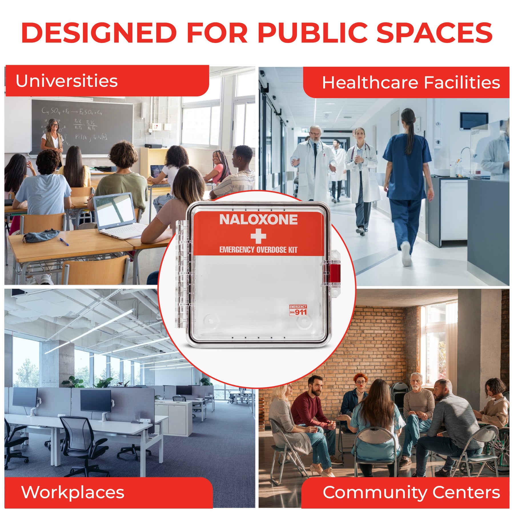 Custom-designed cabinet for storing Naloxone overdose kits, with no lock or alarm to ensure instant access in critical moments.